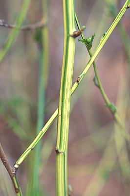Kerria japonica 'Kin Kan'Kin Kan Japanese kerriaCODE: 043-0003ZONE: 5a PRICE: $10.00 POT SIZE: 4.5"sq x 5.0", 1004 ml Just like the 'regular' Kerria species and cultivar, this selection boasts bright yellow blooms in May and then sporadically reblooms until frost (in fact, my Mom once made a nice September arrangement once by floating these flowers in a bowl full of water alongside sprays of beautyberry fruit). The difference is subtle during summer months, but in the winter this plant is a stunner. Instead of the regular bright green stems common to kerria, 'Kin Kan' has stems that fade to a pale yellow with conspicuous green stripes. It makes quite a display against a dark background like Thuja plicata 'Can-can'. I've been looking for this plant ever since I first saw it at the Bernheim Arboretum and Research Forest in early 2003. I'm so happy to be able to share it with all of you again! One final note: I've read that this cultivar can revert, so if you notice any stems that stay pure green, snip them off.![]() (c) 2007 Christopher P. Lindsey |
